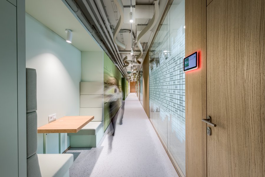 BCG se všudypřítomně snaží dávat důraz na naprosté pohodlí svých zaměstnanců. Důkazem toho je i kuchyně s kamennou deskou a materiálovou kombinací dýhy a laku. Detailisté jistě ocení instalované lišty ve firemních barvách. Také zde se vyplatila naše strategie „propojování profesí. Ve spolupráci s floristkou jsme tu zakomponovali speciální konstrukce, do nichž byly vsazeny mumifikované květiny, které nevyžadují takřka žádnou péči. Z jistého pohledu vzato: v této kuchyni je třešničkou na pomyslném dortu, zabudovaná pivní pípa, která dokonalosti pracovní prostředí dává jistou finesu, jíž jsme z vlastní iniciativy doladili i logem na gravírovaných sklenicích z Plzně.