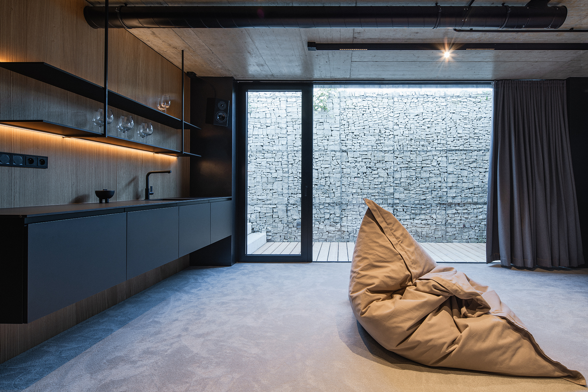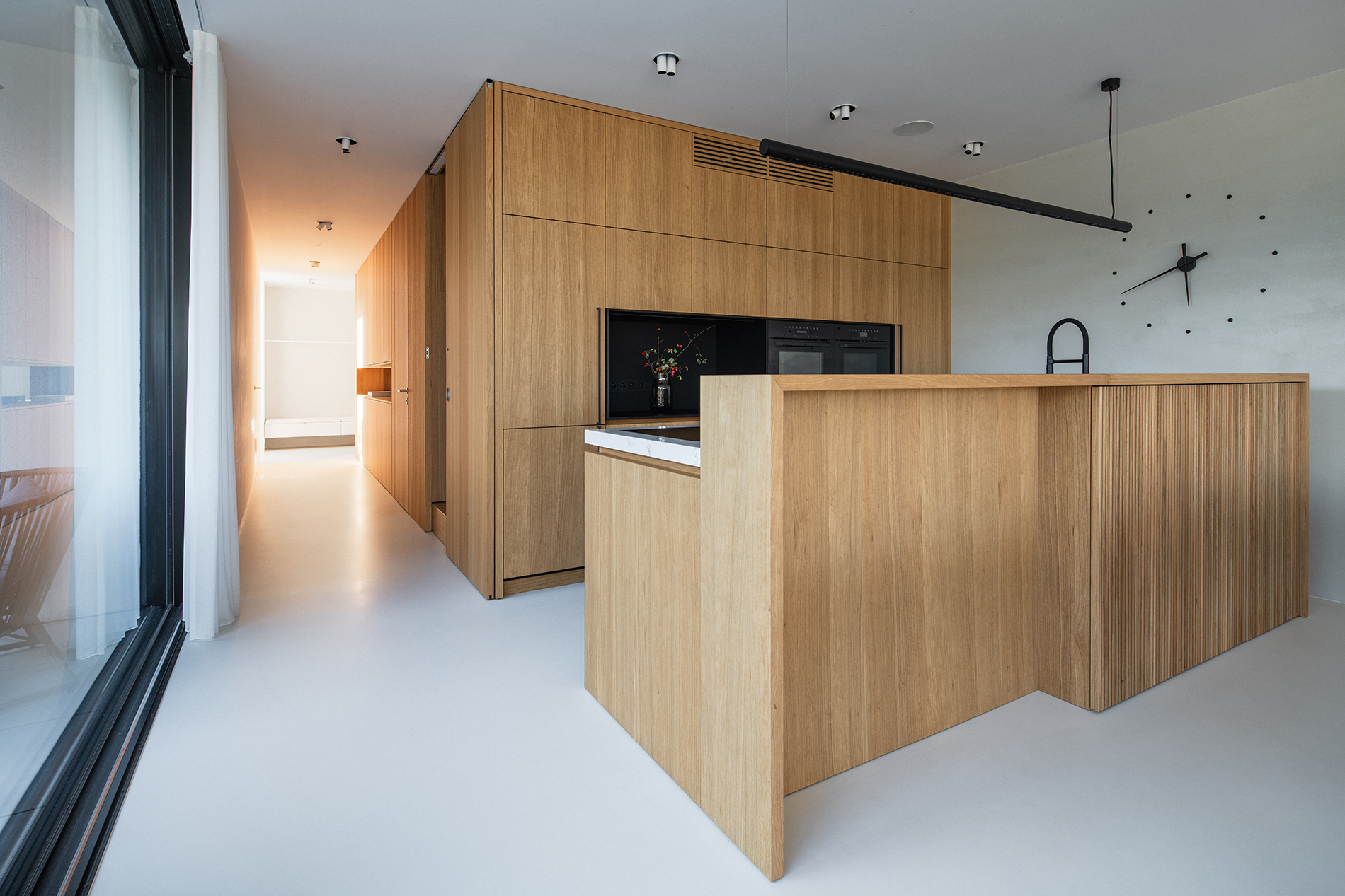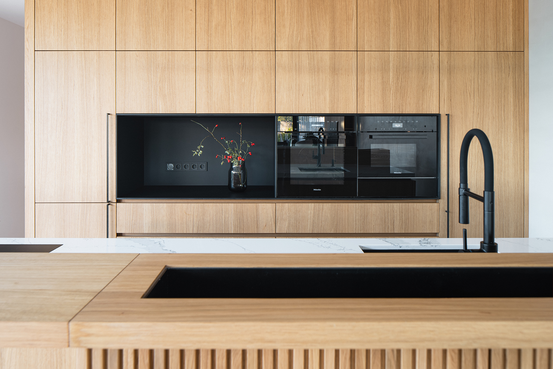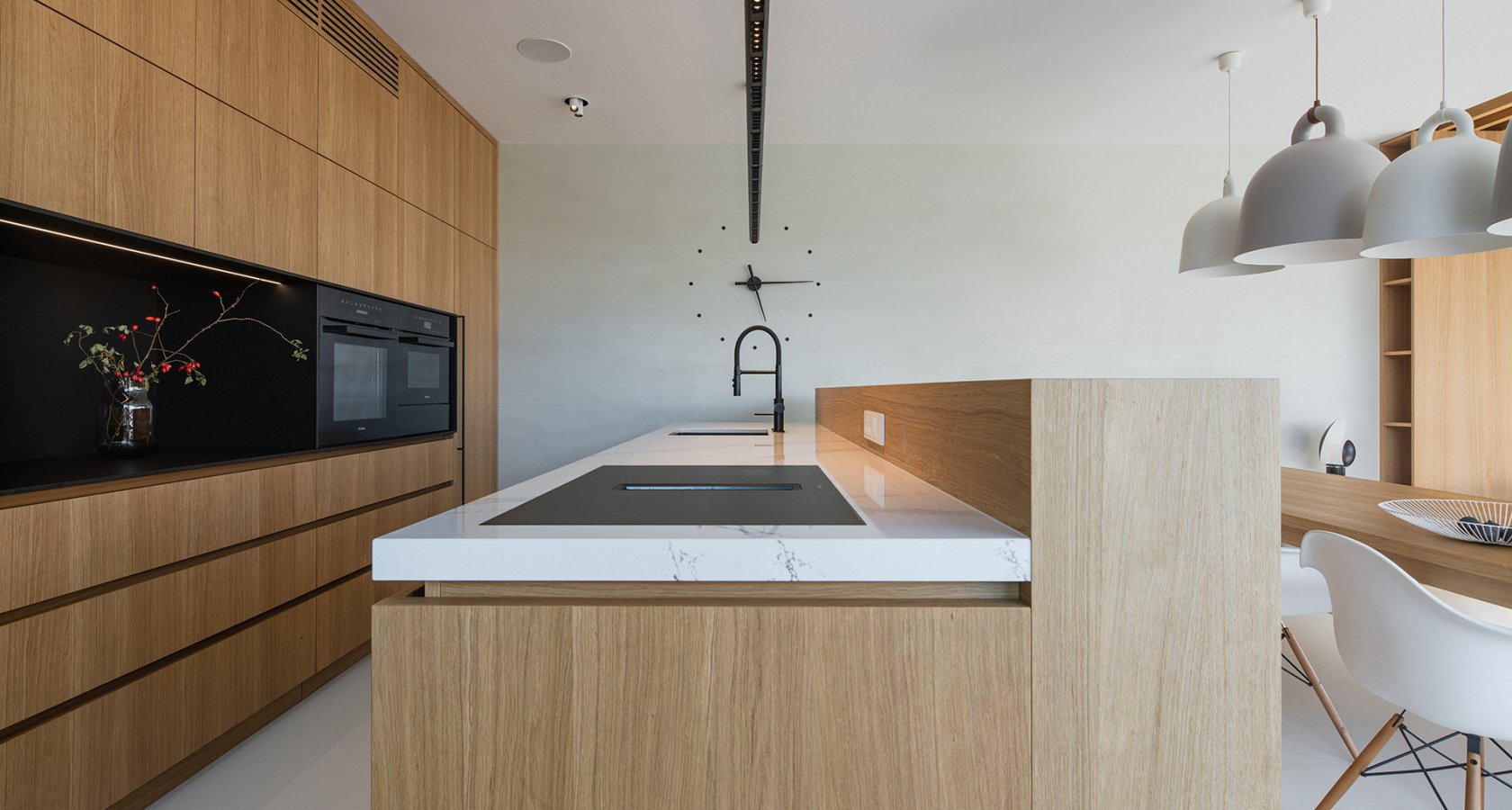 Jak už bylo řečeno dubová dýha je pilířem interiéru. Kuchyni poskytuje velmi útulný dojem. Skříňky a ostrov tak skvěle hrají s černými výplněmi, úchyty, spotřebiči, černou a armaturou. Hlavní roli však jako dominanta obsazuje velká, světlá, kamenná, pracovní deska.