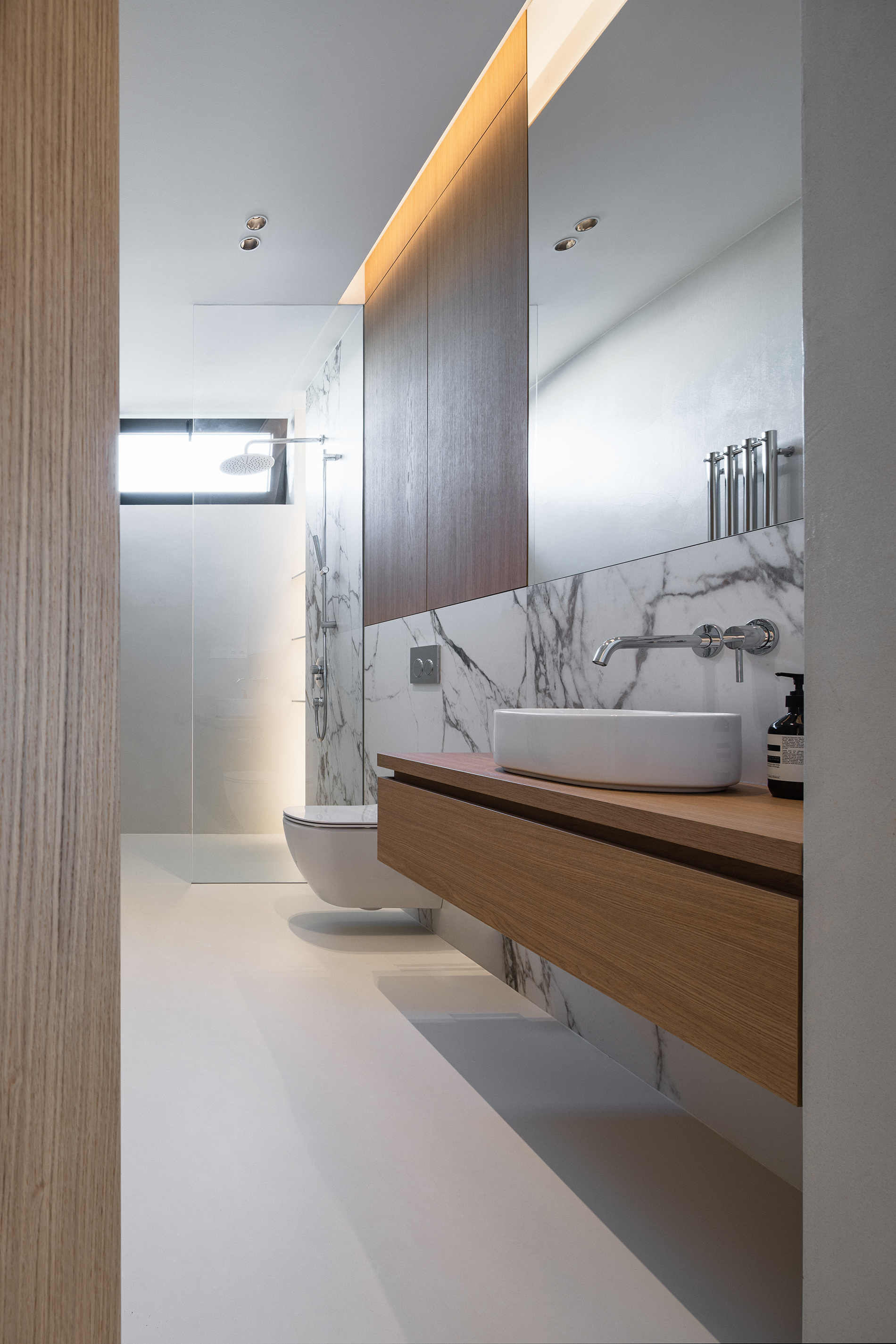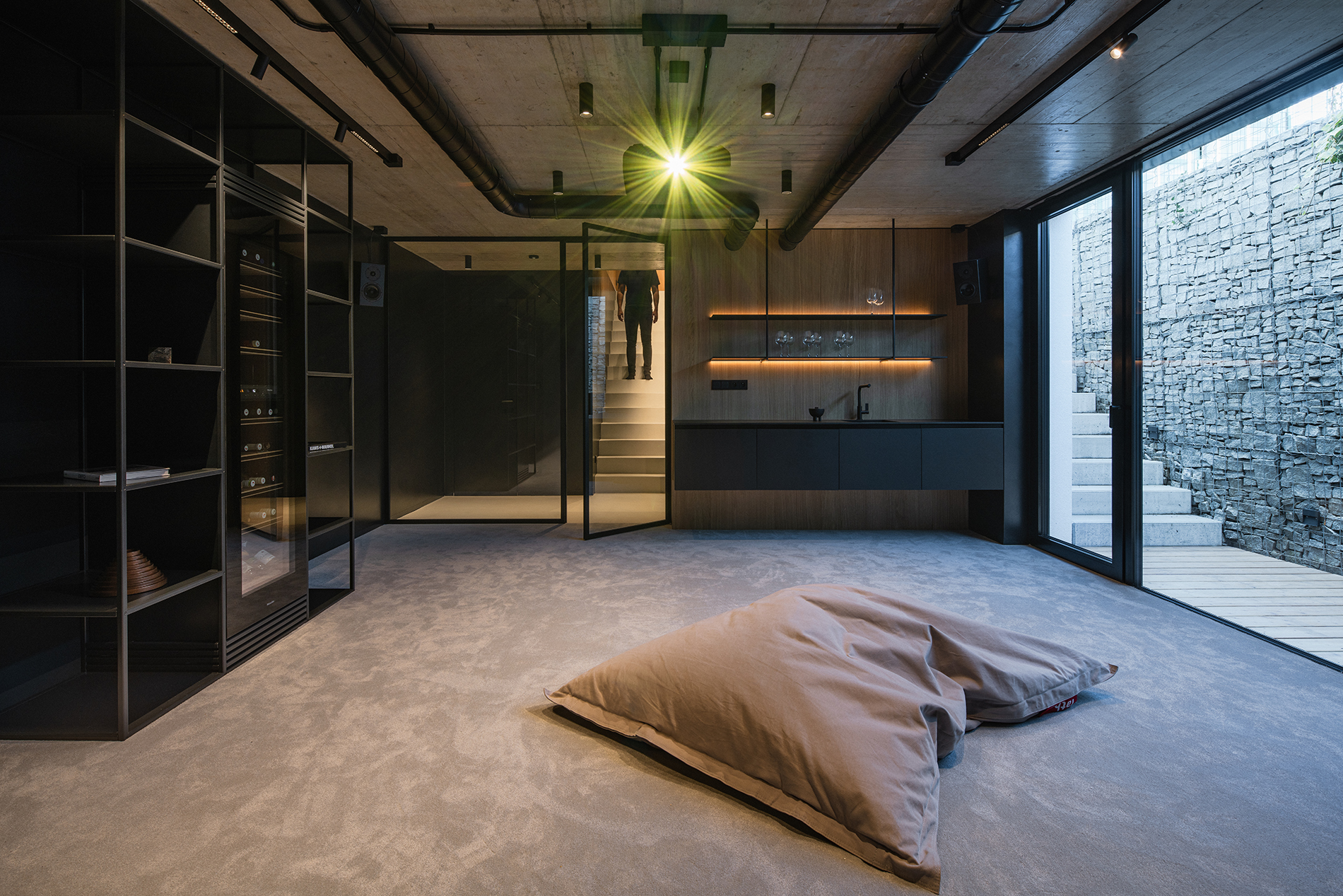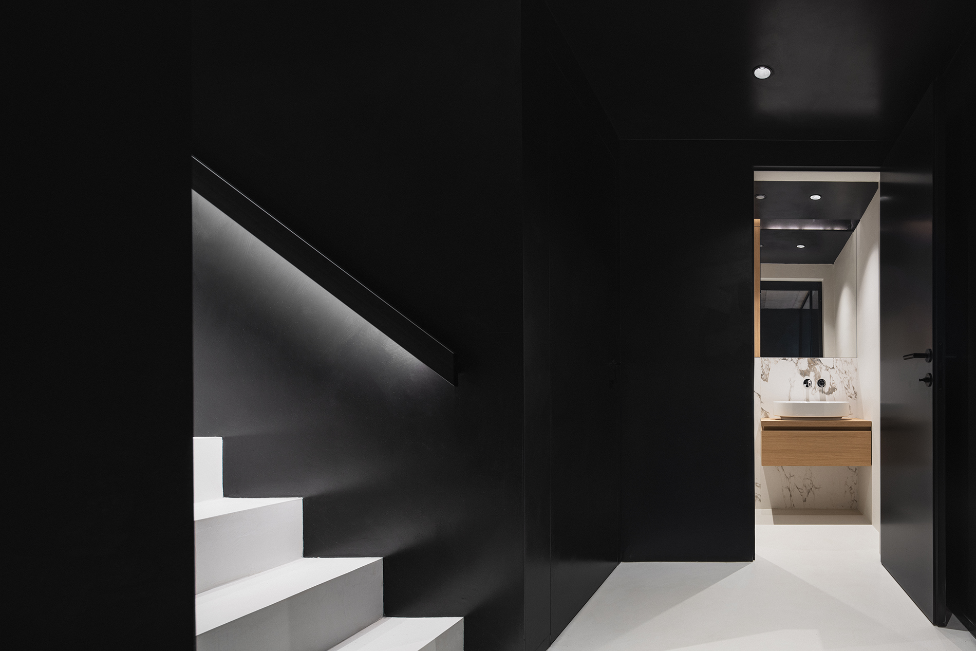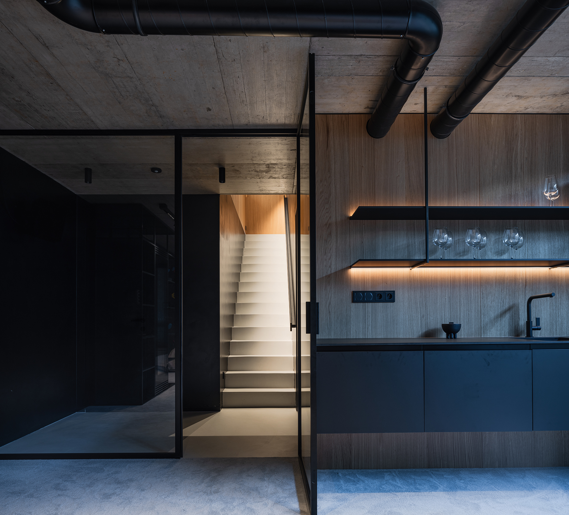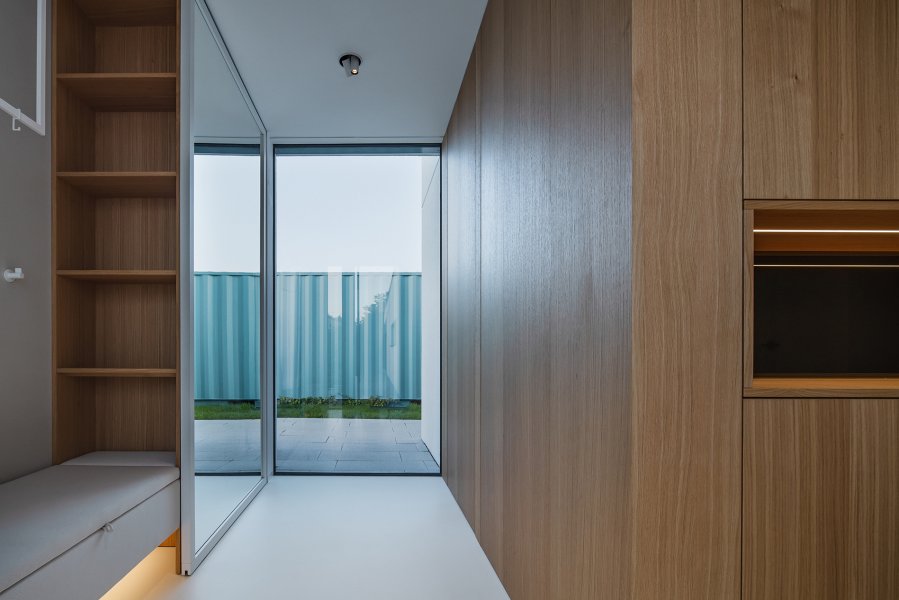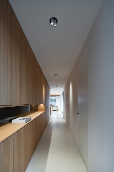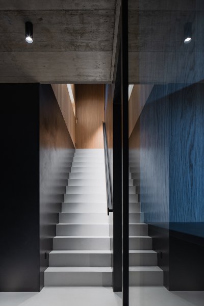 Architekt v této části domu vsadil na jednoduchou geometrii. Naší rolí ji bylo respektovat a celý prostor včetně schodů obložit funkčními prvky a pohrát si s finesami tohoto návrhu. Mezi ně určitě patří zábradlí. Madlo je zapuštěno v obložení stěn. Nikde tak nepřekáží, nezmenšuje pohybový prostor a hlavně září. Otvor pro ruce je podsvícen a pokud ve dne přichází paprsky přes skleněnou výplň, rozehrává se zde doslova světelné divadlo.