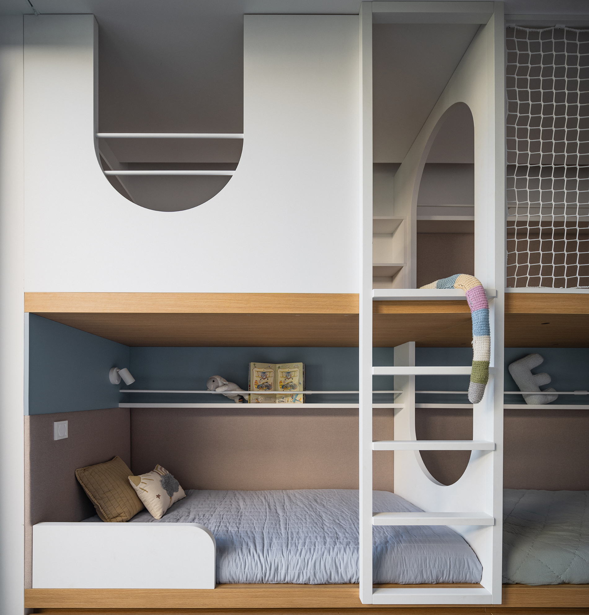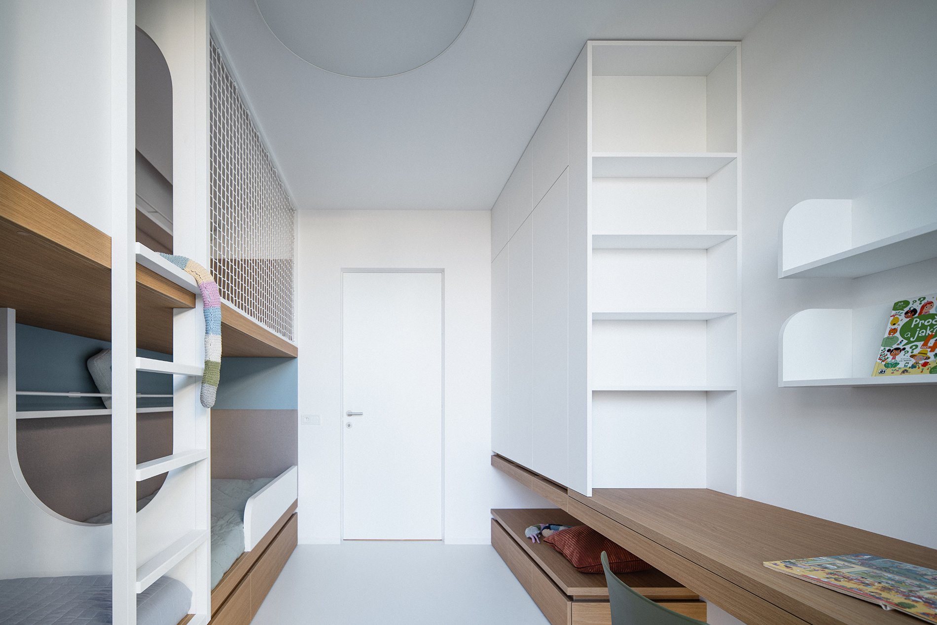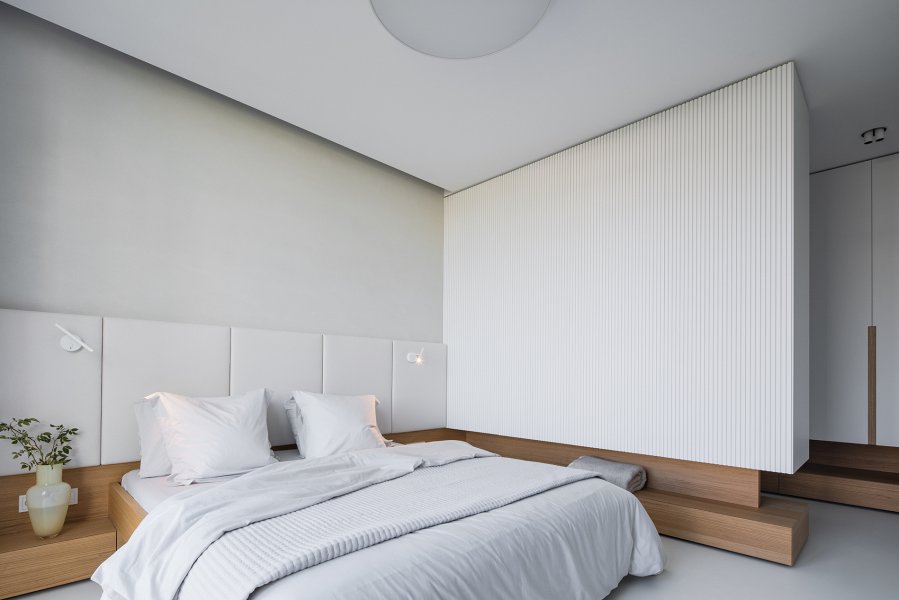 Scénář tohoto díla nás zavádí také do ložnice. Zde stojí za povšimnutí probíhající dubový nábytek v podobě nočních stolků, který svými liniemi protíná velkou část místnosti a míří i pod další zajímavý prvek. Z pohledu ležících se jeví jako stěna a dává velmi čistý výraz svou bílou barvou a velkou plochu rozmělňují lamely. Ovšem z druhé strany této stěny mají domácí spoustu odkládacího prostoru v prostorné šatní skříni. Za zmínku stojí i čalounění, které patří do souboru prvků, které jsme pro tento skvost realizovali.
