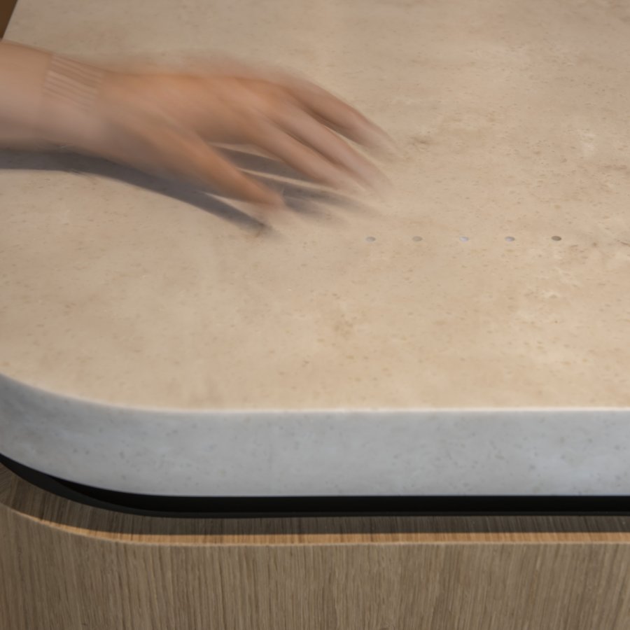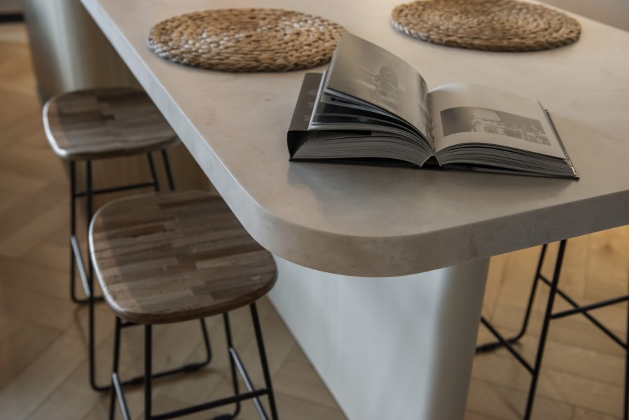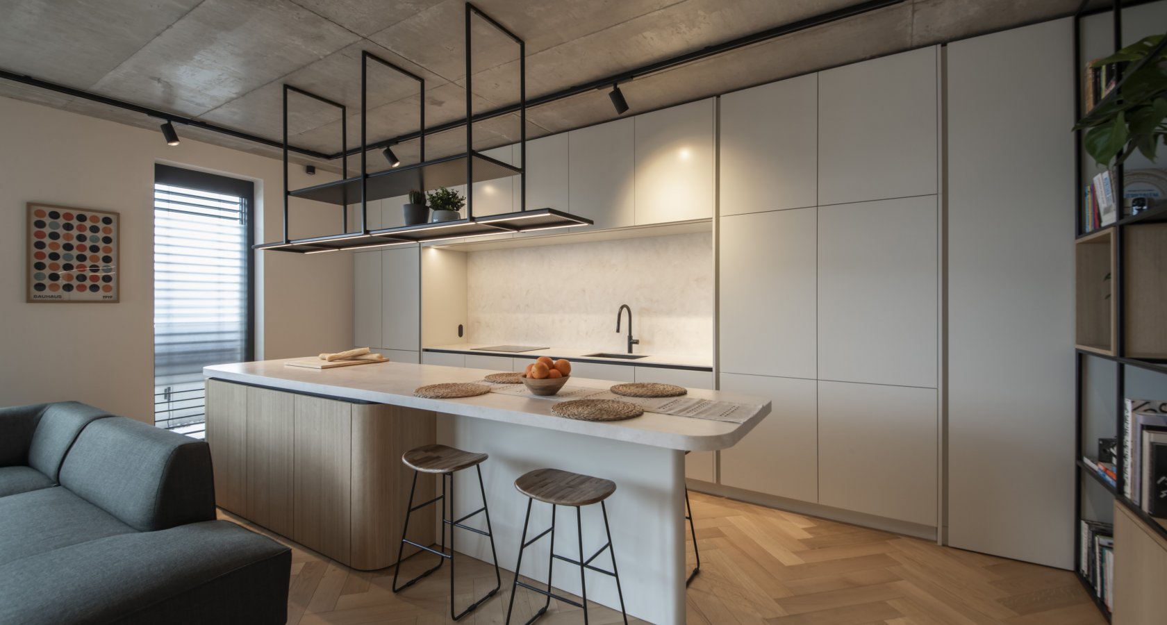 Pracovní deska z materiálu HI-MACS® skrývá unikátní prvek – dotykové ovládání osvětlení integrované přímo do umělého kamene. Stačí letmý dotyk na označeném místě a scéna se rozzáří bez nutnosti klasických vypínačů. Nad ostrůvkem se vznáší subtilní, černě lakovaná konstrukce pro osvětlení, která tvarem koresponduje s ostatními kovovými prvky v bytě.