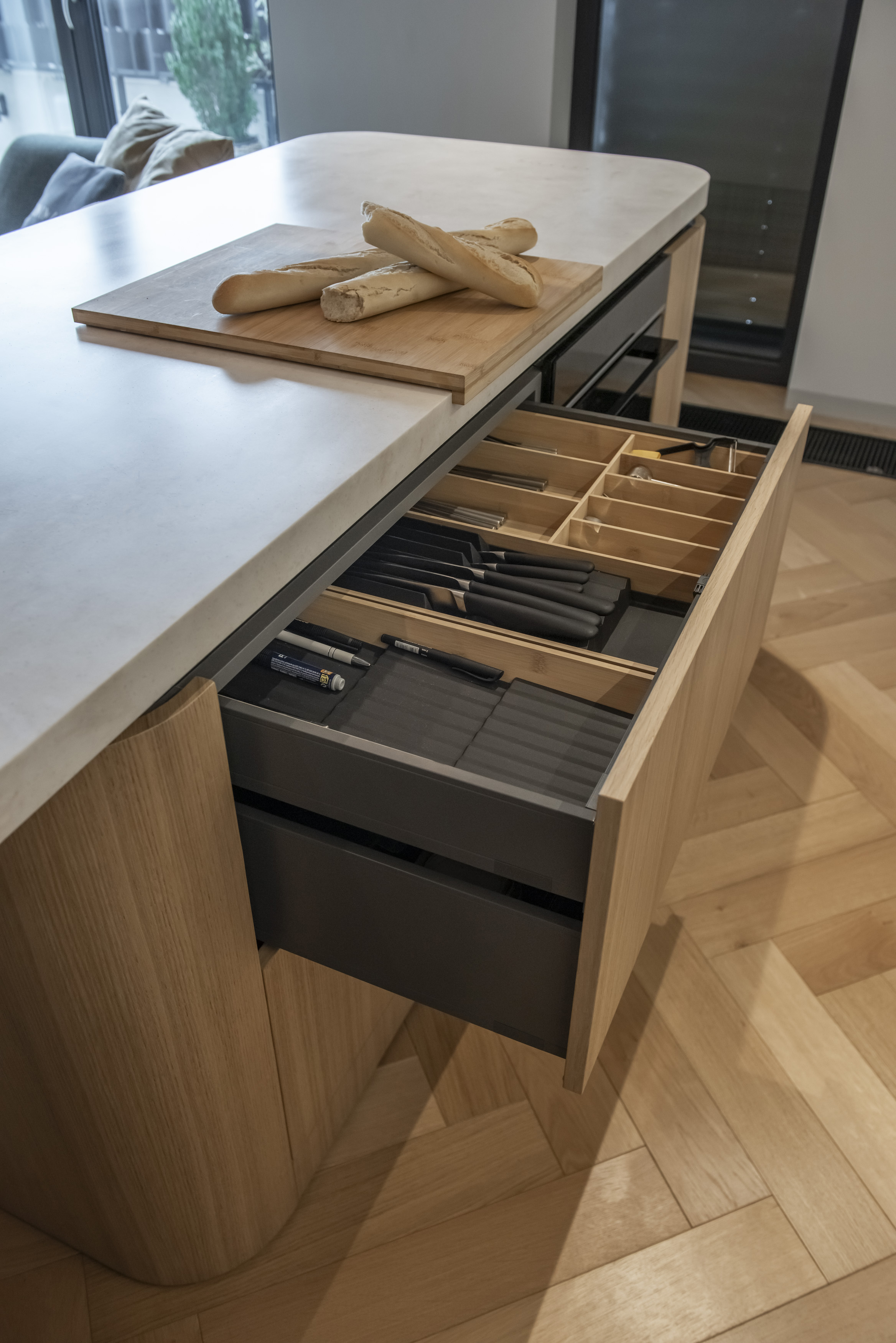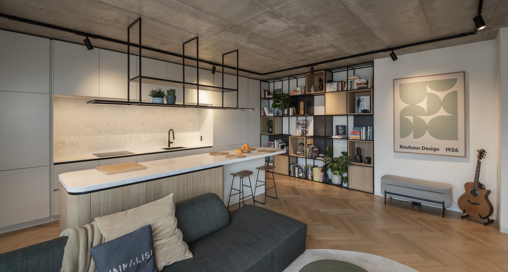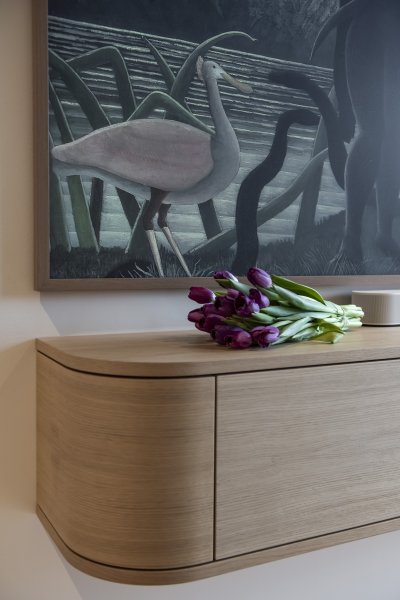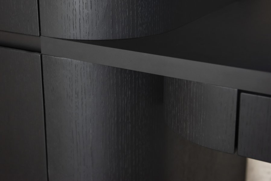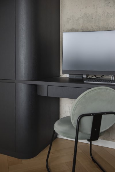 Charakteristickým prvkem této realizace jsou zaoblené rohy nábytkových sestav. Tento detail, inspirovaný prvorepublikovým designem 30. let, zjemňuje přísné linie moderní stavby s betonovými stropy. Zaoblení najdeme na TV skříňce, koncích šatních sestav i na dominantním kuchyňském ostrůvku.