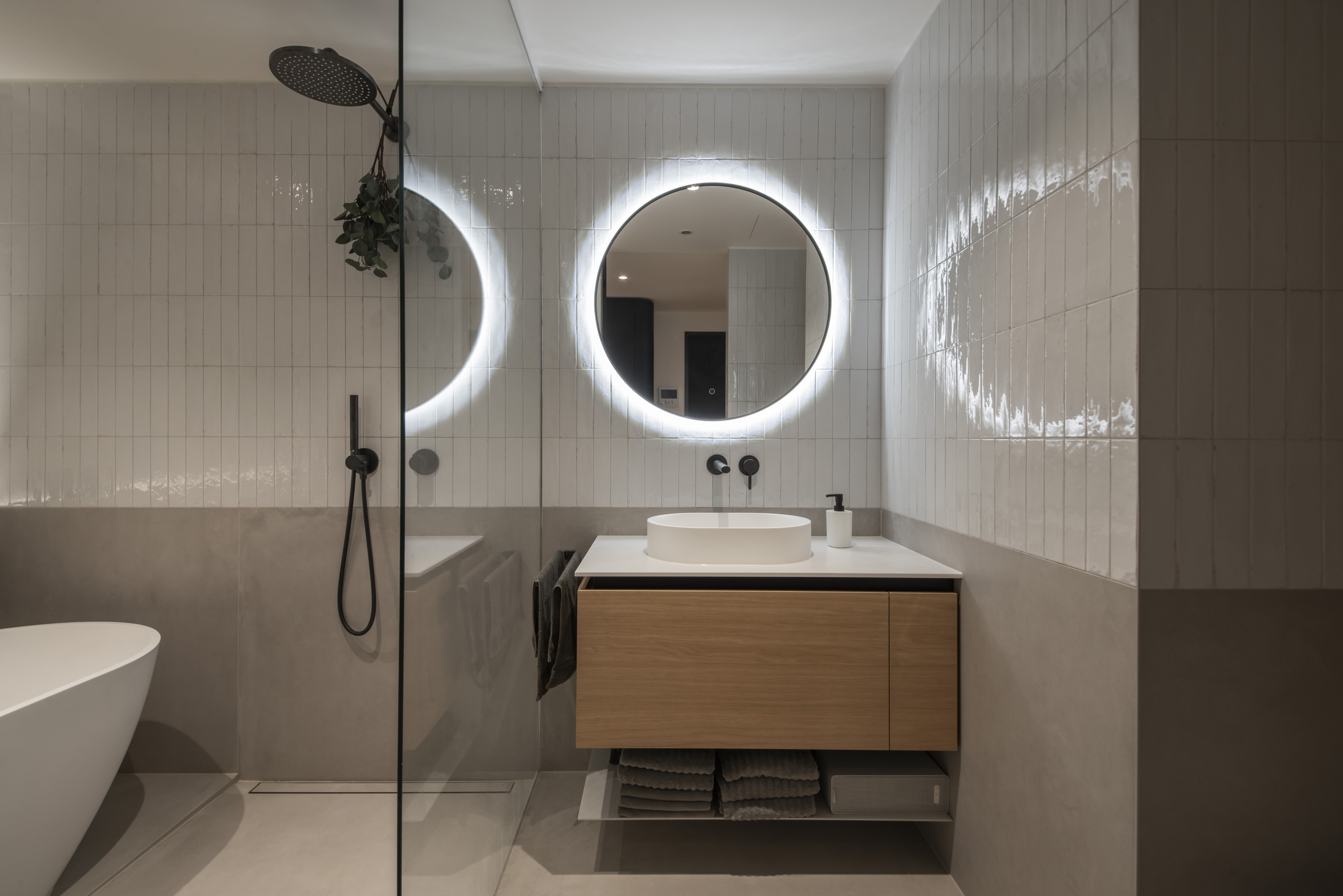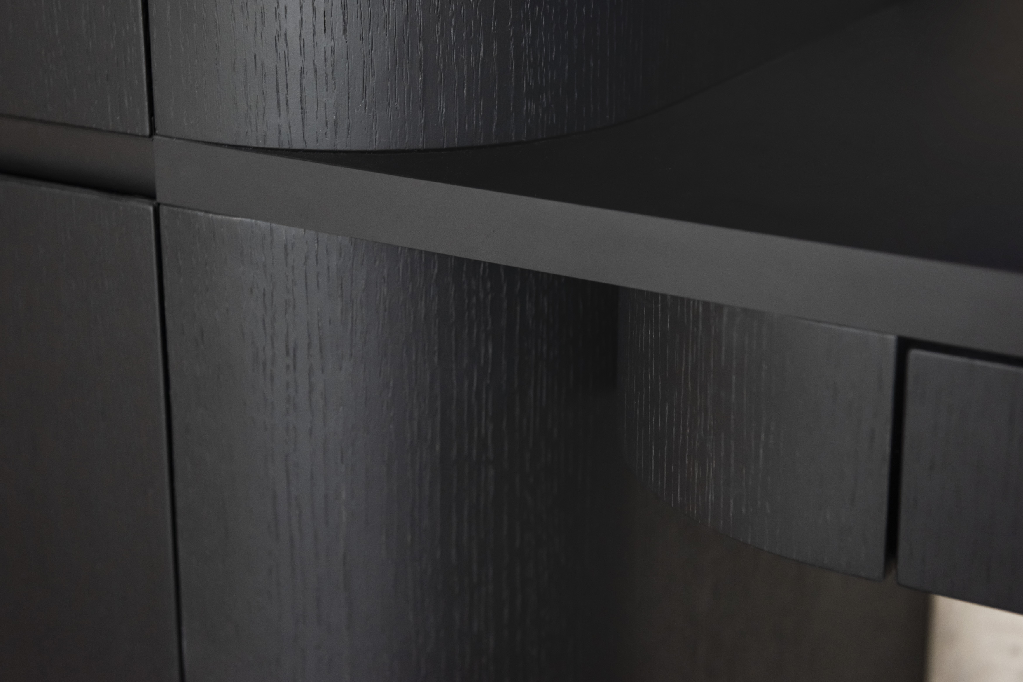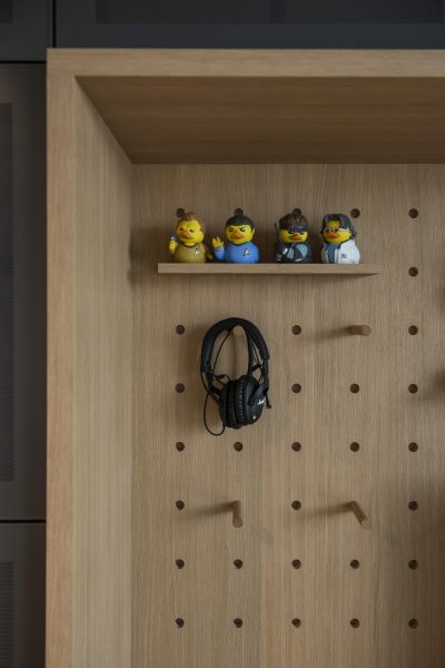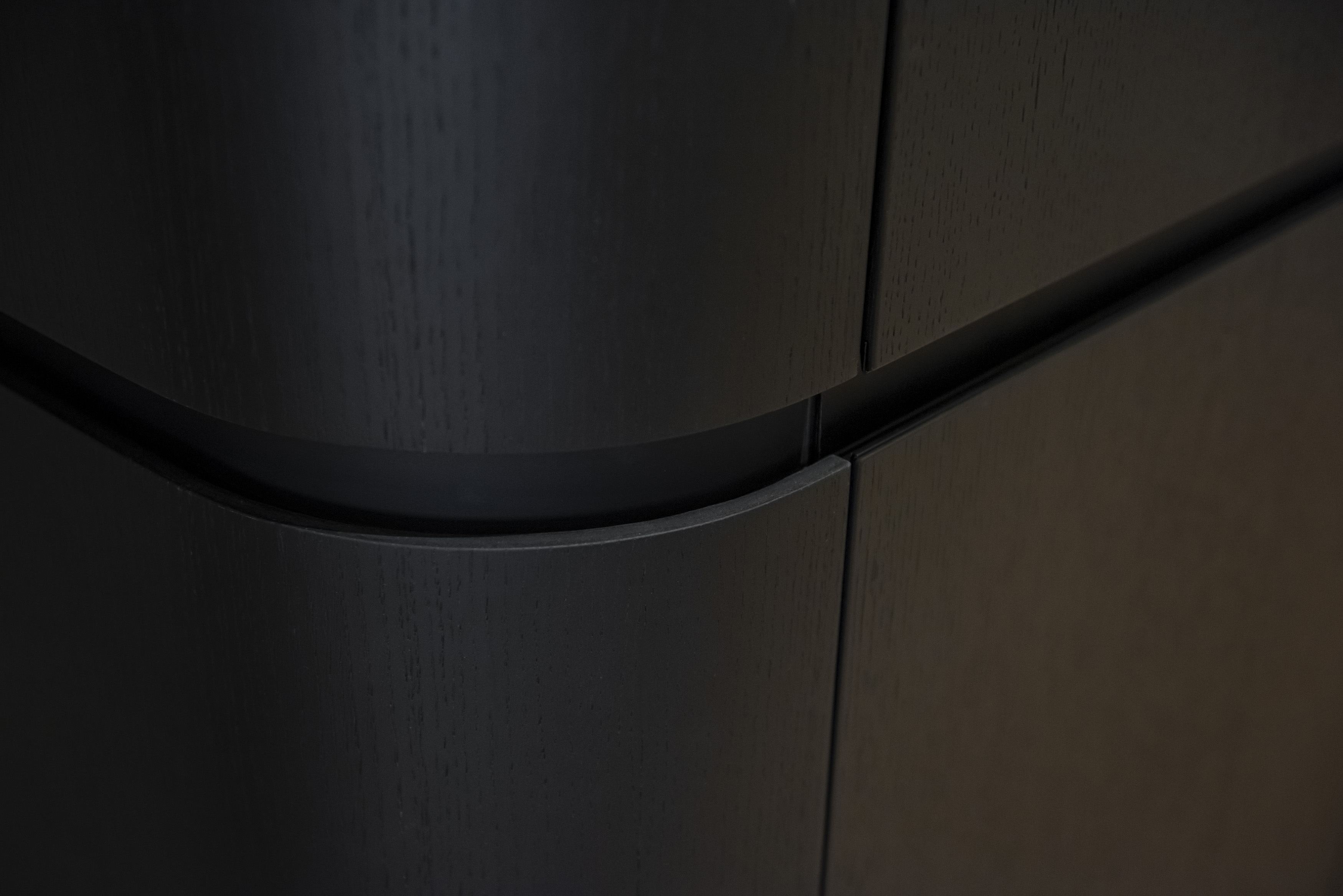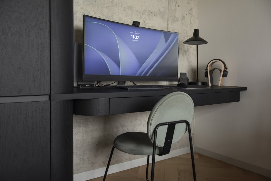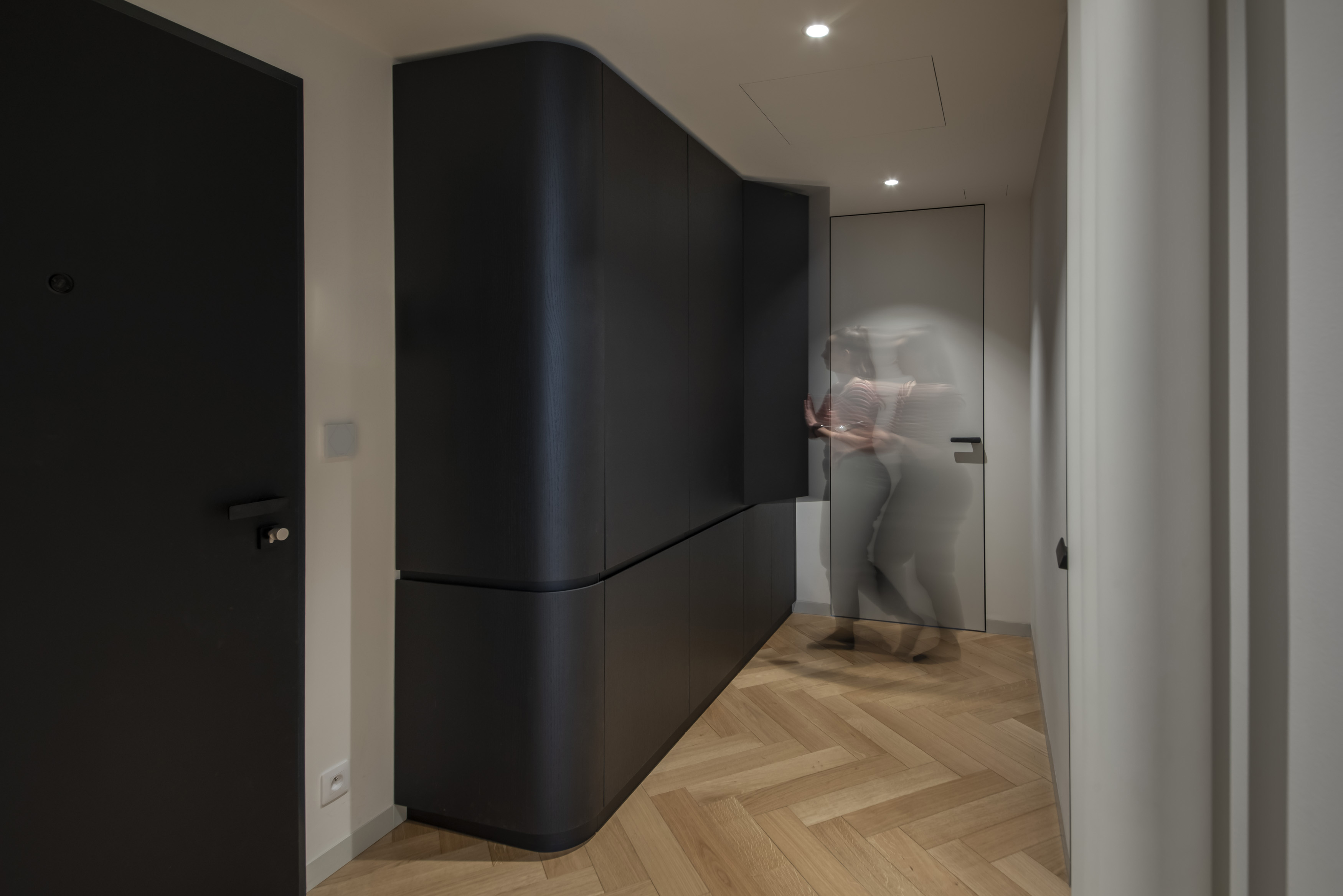 Celým bytem se prolíná promyšlená trojkombinace povrchů: čistě bílý matný lak, přírodní dubová dýha a kontrastní černě lakovaná dubová dýha. Tato paleta vytváří přirozený rytmus interiéru – zatímco bílá prosvětluje, dub dodává hřejivost a černá dýha vnáší do prostoru potřebnou hloubku a eleganci.
