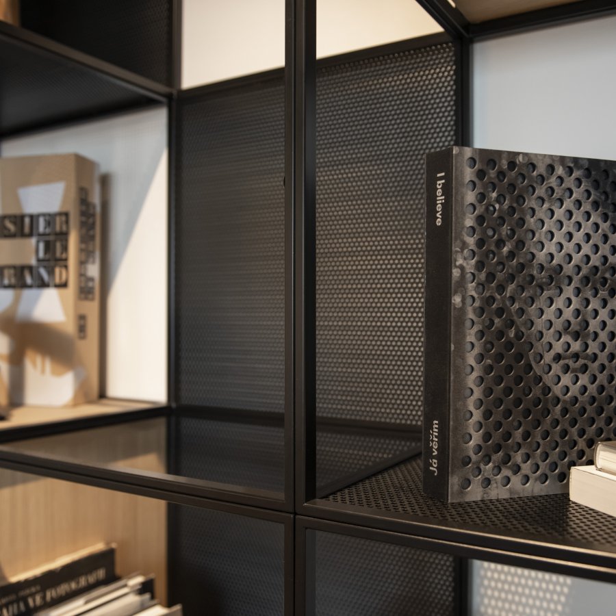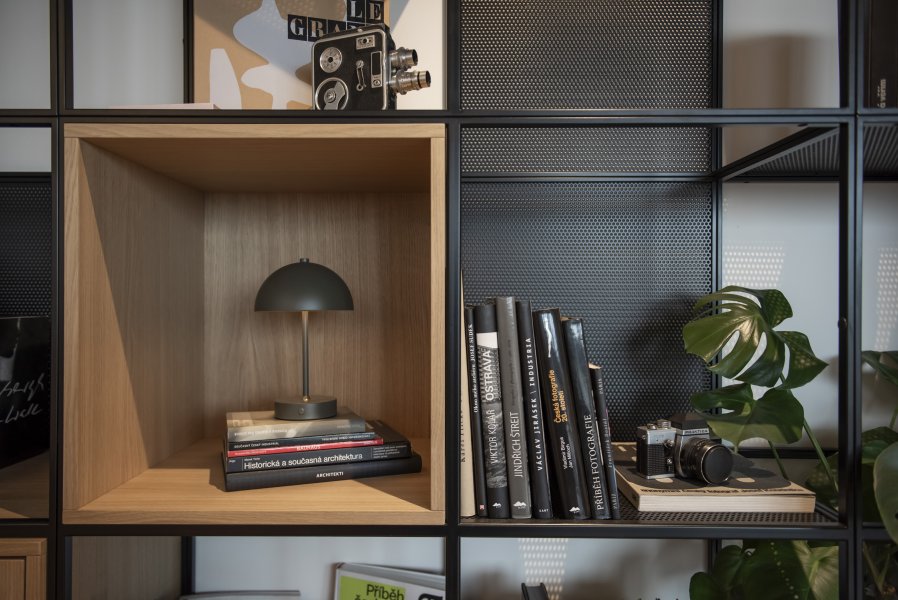 Při návrhu a výrobě obývací stěny jsme vsadili na černě lakovaný kov v kombinaci s dubovými moduly. Tato "stěna" není jen úložným prostorem, ale designovým prvkem. Za pozornost stojí využití děrovaného plechu. Tento prvek zajišťuje vizuální lehkost a hru světla, která stěnu oživuje z každého úhlu pohledu. Precizní napojení kovových profilů na dýhované boxy je důkazem naší zaměřenosti na detail. Celou sestavu jsme realizovali kompletně na klíč, a to včetně zakázkové výroby subtilní kovové konstrukce, kterou jsme připravovali přesně na míru danému prostoru.