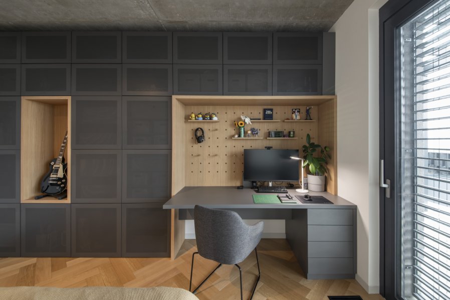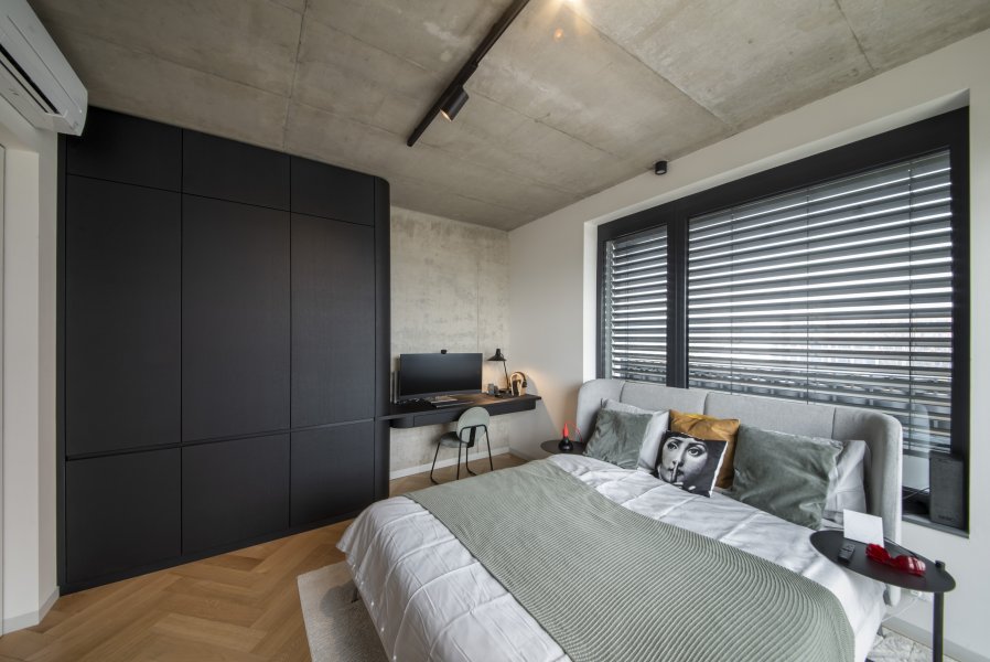 Ložnice pokračuje v nastaveném konceptu kombinace betonové stěrky a černé dýhy. Šatní skříně s integrovaným pracovním koutem opět využívají zaoblené rohy, čímž opticky "plynou" prostorem a nezmenšují průchody v chodbách.