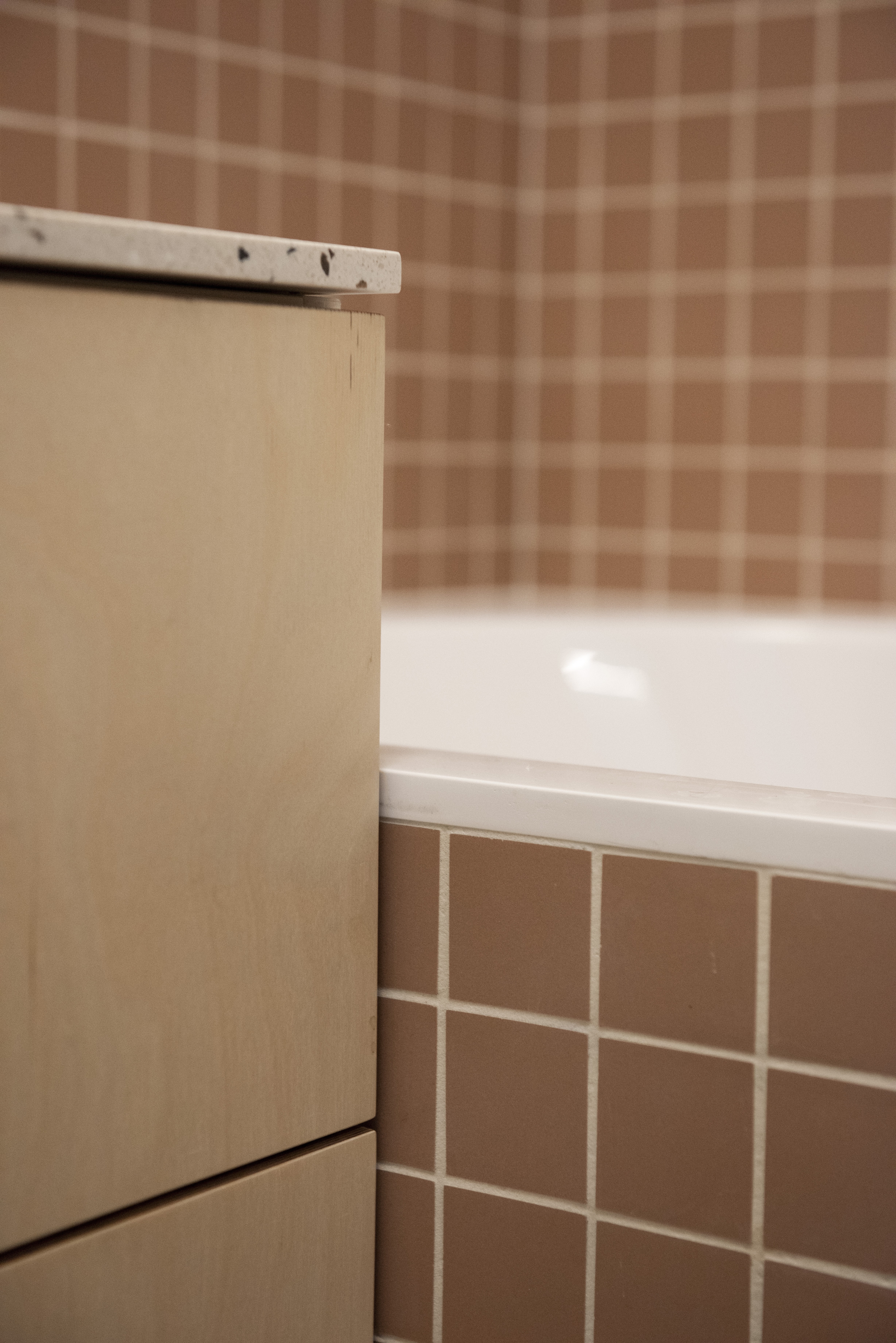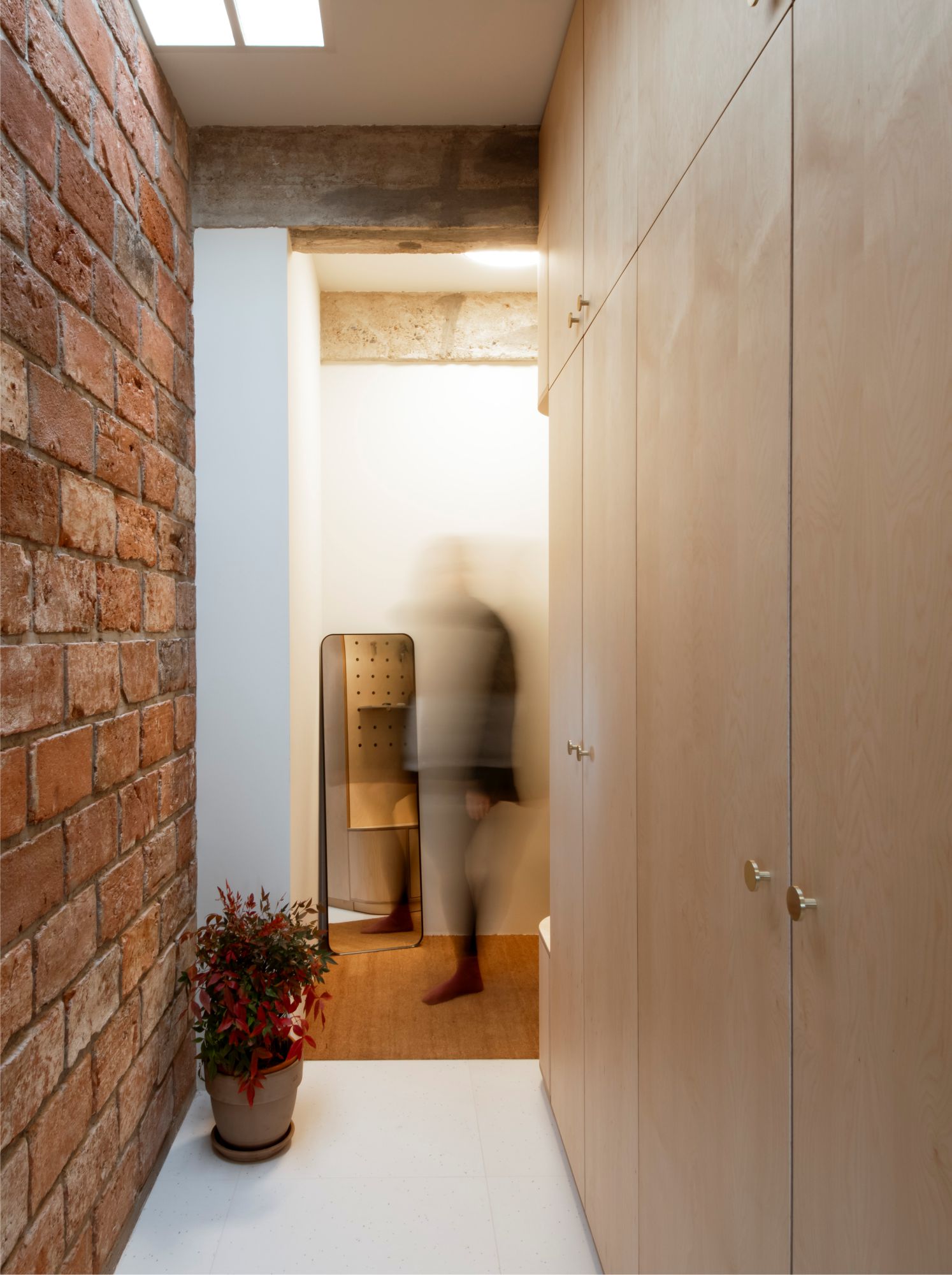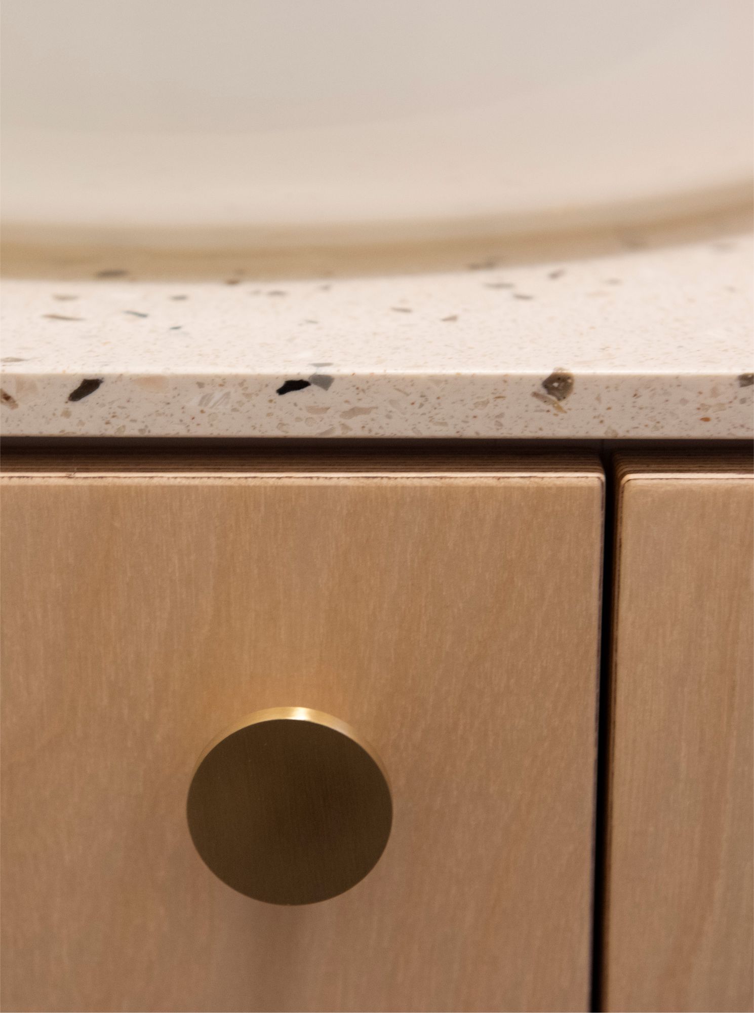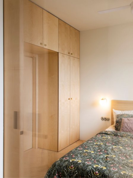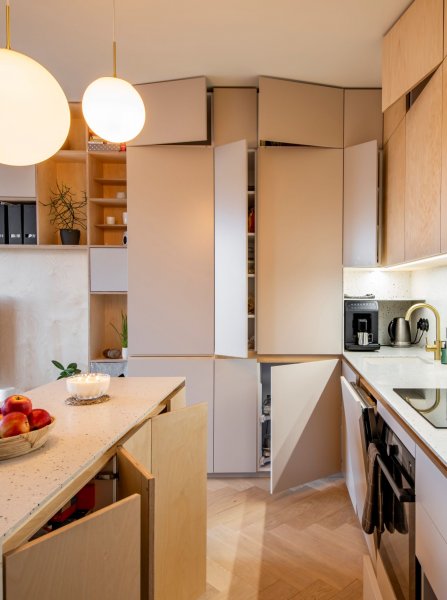 Hlavním materiálem propojující celý interiér je březová překližka.