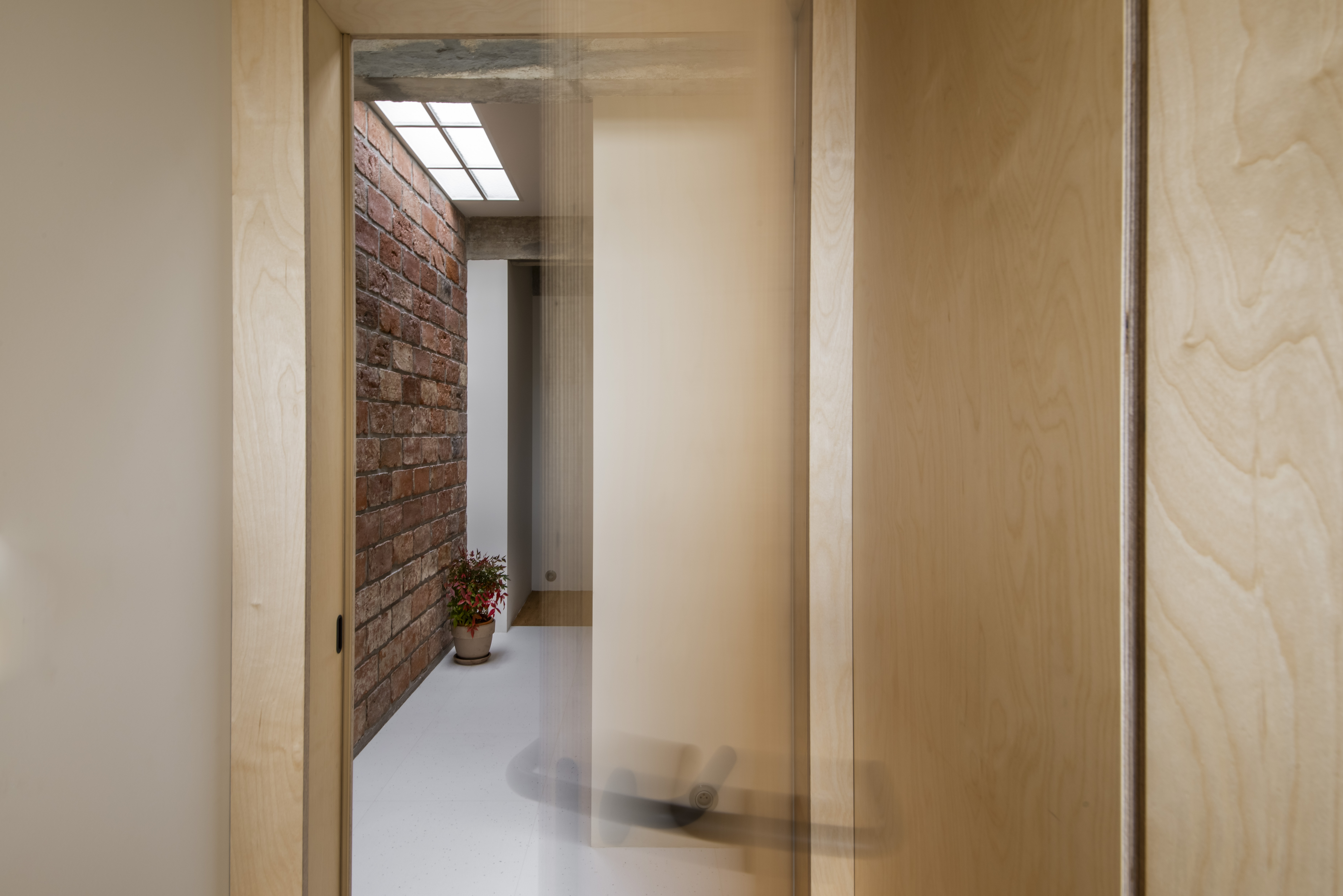 Dominantou se staly výrazné materiály a kontrasty, které se prolínají celým interiérem. Hlavním materiálem je březová překližka.